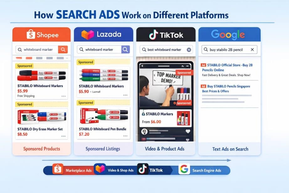 Here’s a clear, side-by-side explanation of how Search Ads work on Shopee, Lazada, TikTok, and Google, with how you set them up, how you pay, and when they are useful — especially for sellers like your STABILO store. ✍️