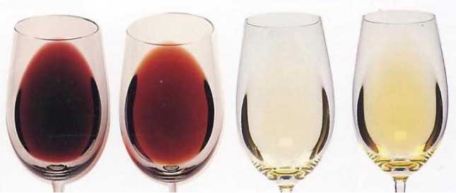 先倒入四分之一杯左右的葡萄酒;以白色为背景,将酒杯稍微向外倾斜,然后观察酒的颜色。葡萄酒的颜色反映了葡萄酒的成熟度,比起香味和口感,利用颜色比较,容易区别出葡萄酒的不同。